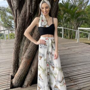 A Calça Lenço ZIN, confeccioanda em tecido toque de seda, é uma peça confortável, elegante e com caimento super leve. Possui modelagem reta, transpassada, com amarração frontal e fenda nas laterias. Peça chave para todos os momentos por ser linda e super versátil!